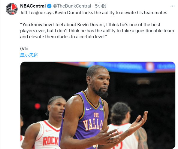 前NBA球员蒂格质疑杜兰特的带队能力,谈到詹姆斯、乔丹和杜兰特,杰夫-蒂格在节目中表示:我认为他(詹姆斯)的伟大之处在于能提升球队整体实力。你们知道我对杜兰特的评价,他是历史最佳球员之一,但我认为他无法将一支实力存疑的球队提升到一定高度。